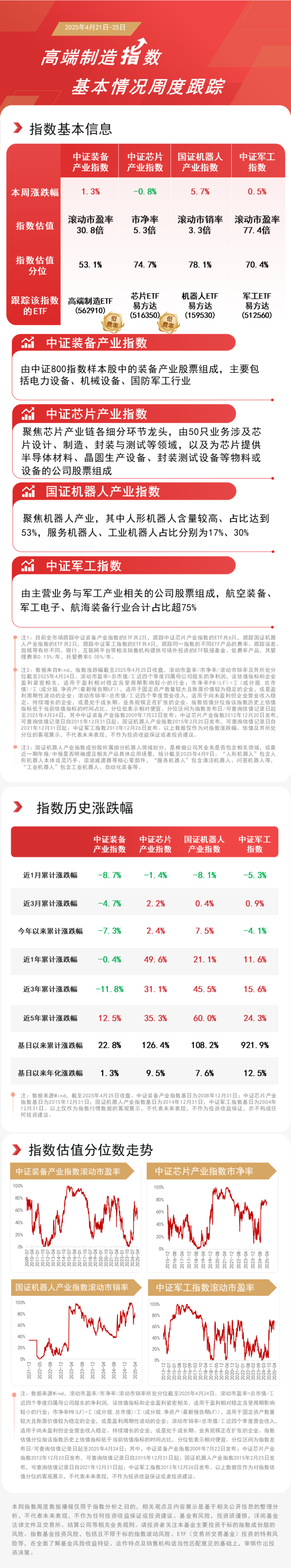 本周国证机器人产业指数上涨5.7%,中证装备产业指数上涨1.3%,中证军工指数上涨0.5%,中证芯片产业指数下跌0.8%。Wind数据显示,截至4月24日,机器人ETF易方达(159530)连续12个交易日获资金净流入,最新份额超7亿份,最新规模近10亿元,均创下历史新高。